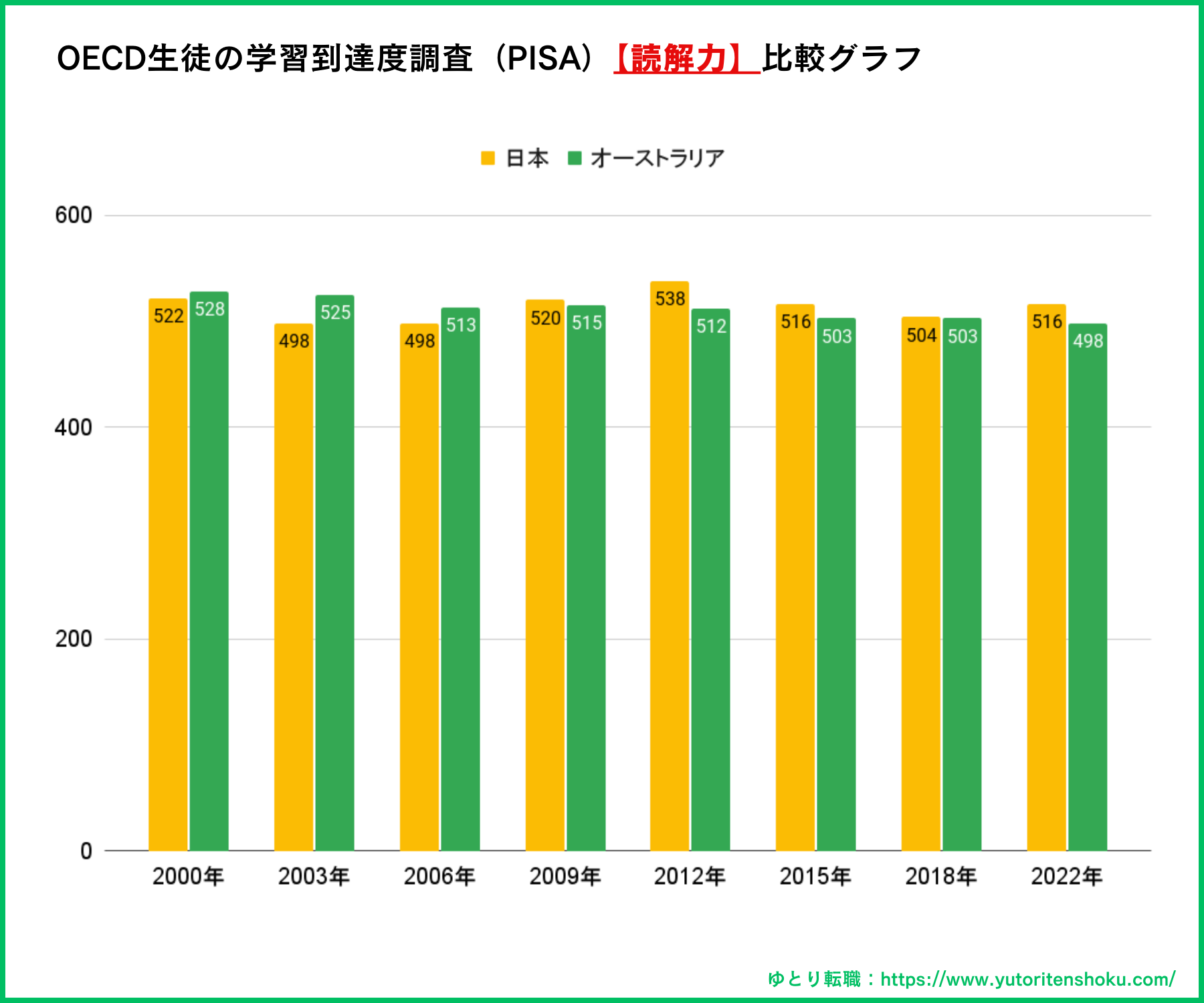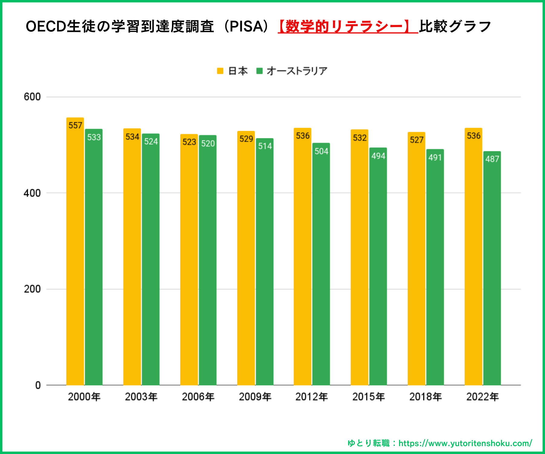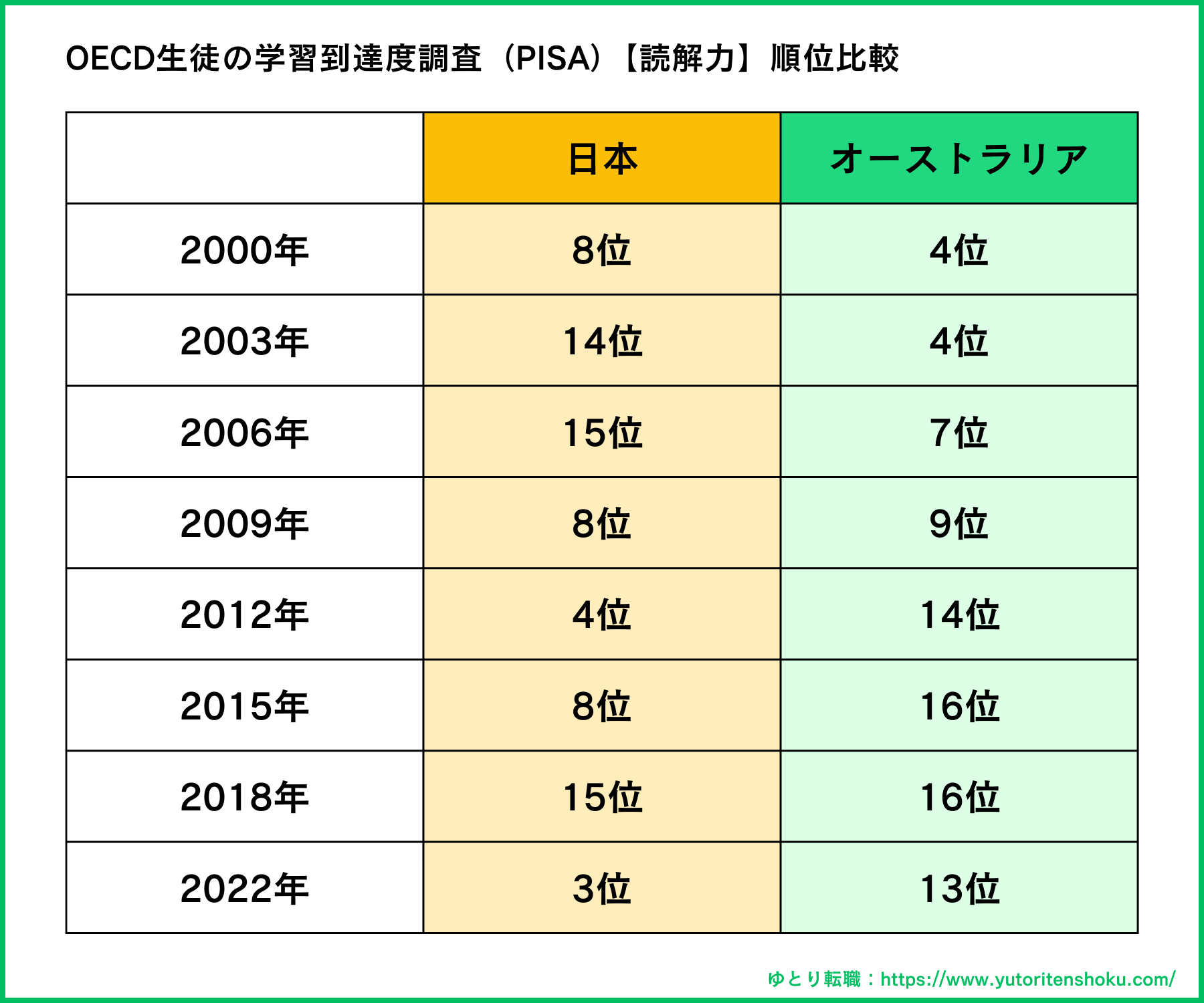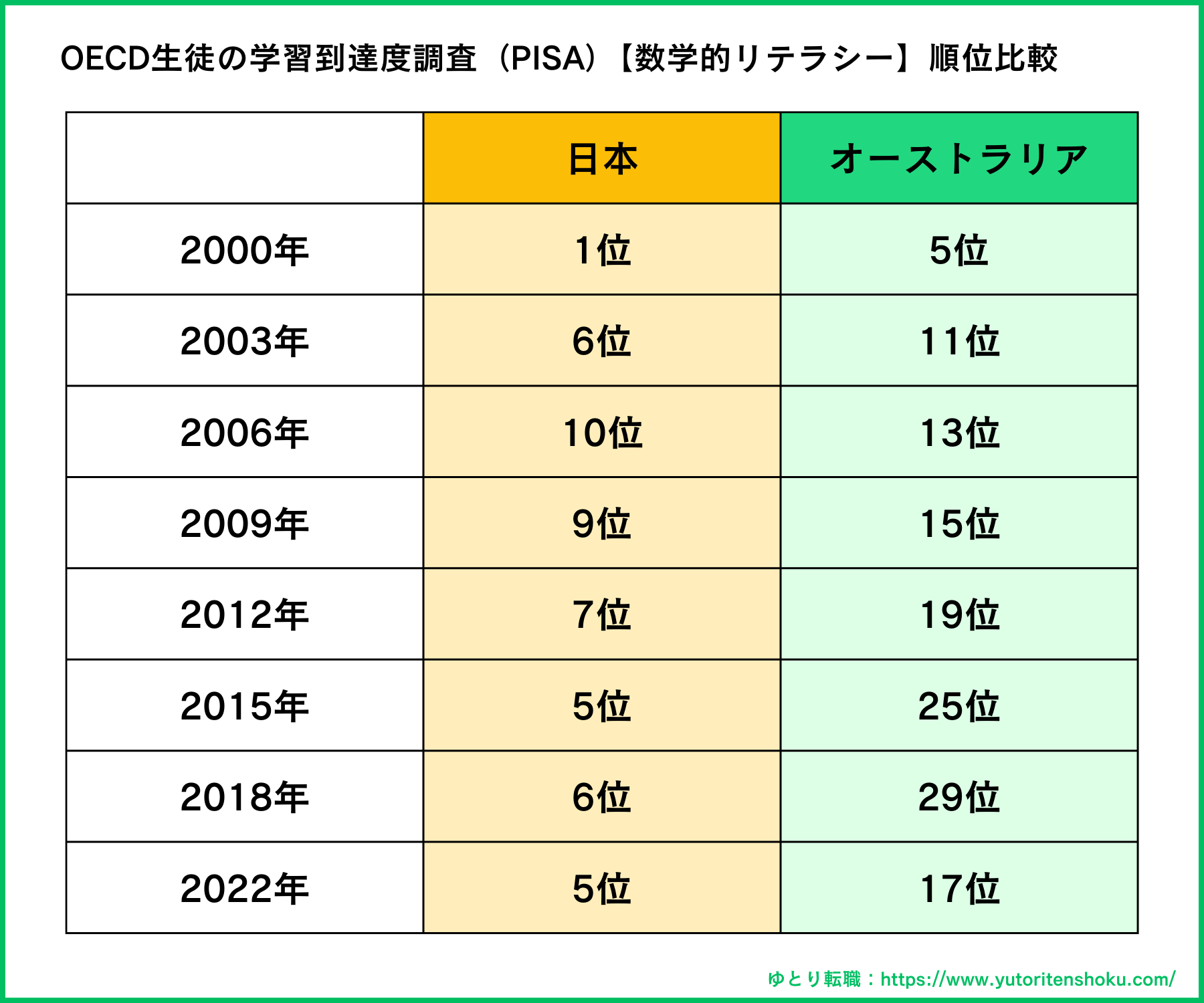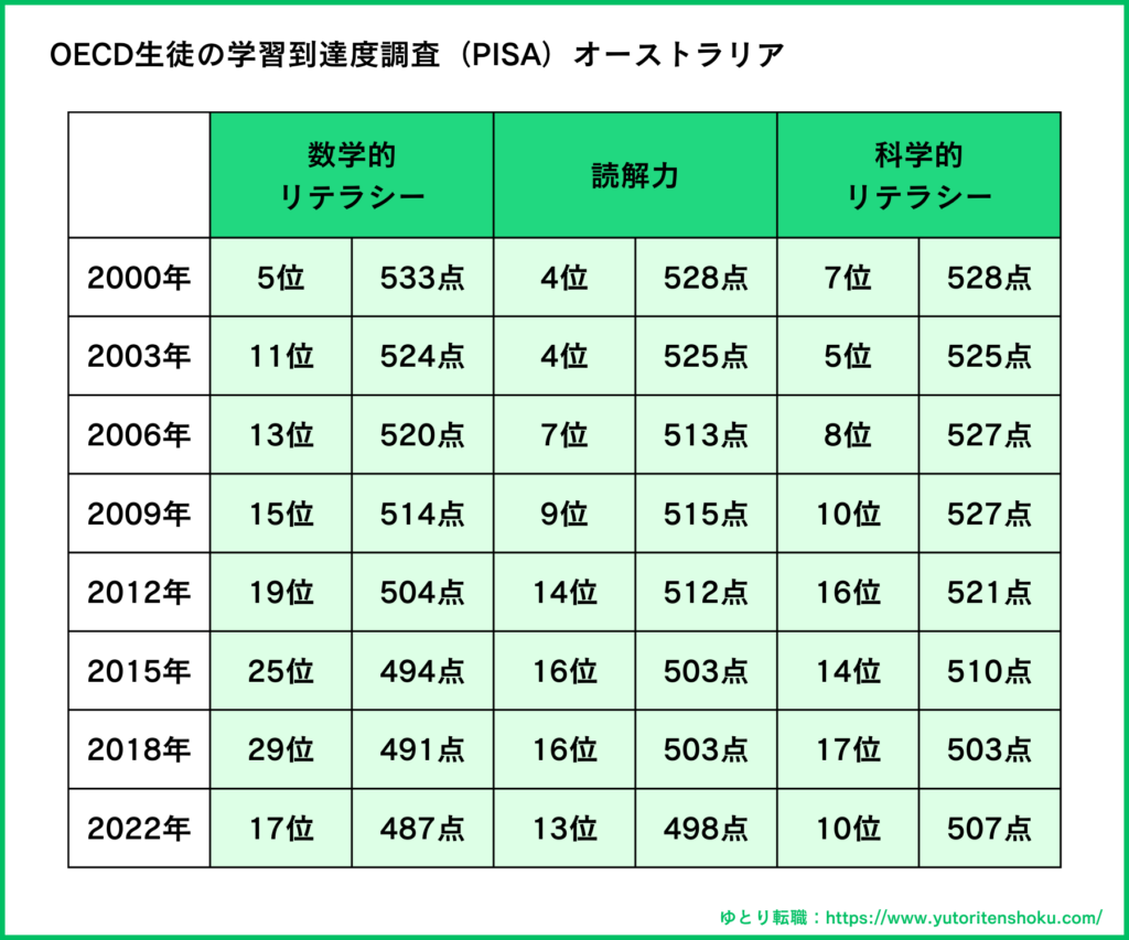 オーストラリアの教育の質を客観的に評価する一つの指標として、OECD(経済協力開発機構)が実施するPISA(生徒の学習到達度調査)の結果があります。