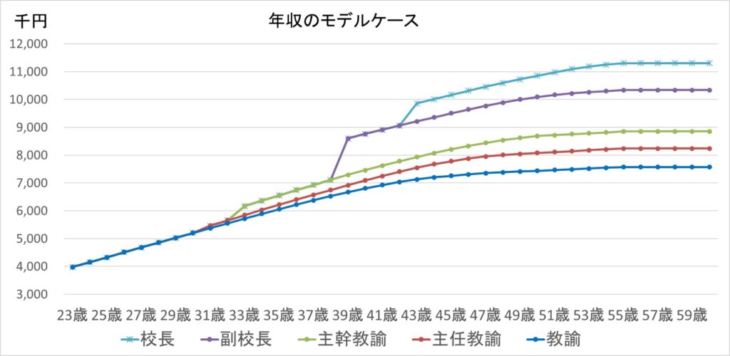 この表から分かる通り、中学校教師は校長になっても年収1000万円には届きませんでした。