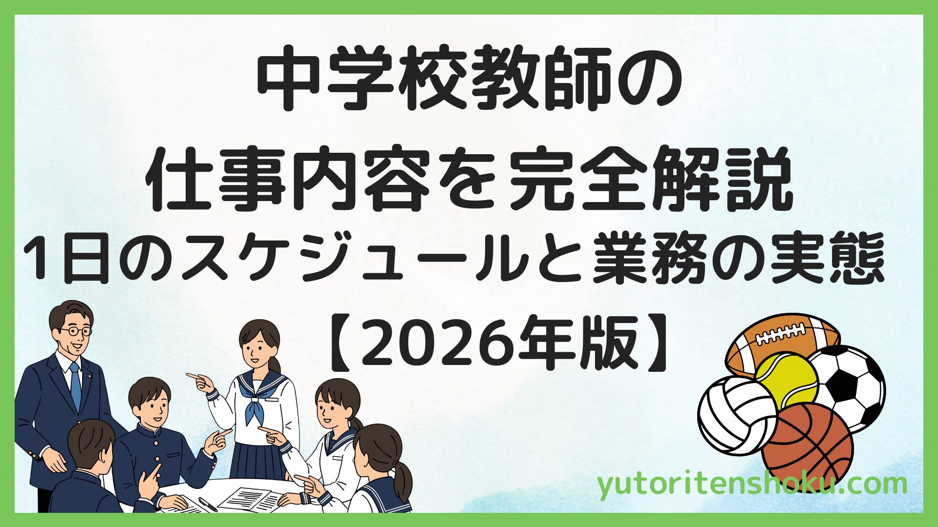 授業準備、生徒指導、部活動指導、保護者対応、進路指導など、教師の仕事は想像以上に多岐にわたります。本記事では、中学校教師を目指す学生や転職を考えている社会人の方に向けて、元中学校教師が、仕事内容の全体像からリアルな1日のスケジュール、やりがいと課題まで徹底解説します。