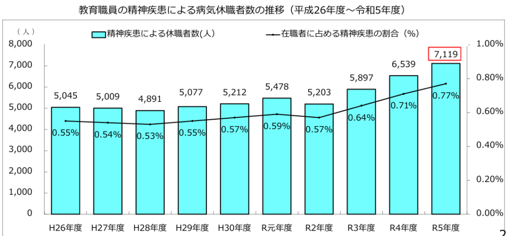 文部科学省によると、令和5年度に精神疾患で休職した公立学校教職員はなんと、7,119人に上ると報告されています。