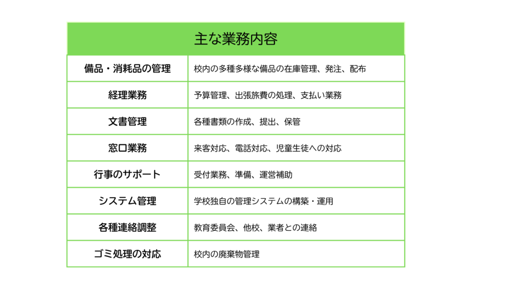 教員とは異なる形で学校運営を支え、多忙な教員がスムーズに教育活動に専念できる環境を作る、重要な役割を担っています。