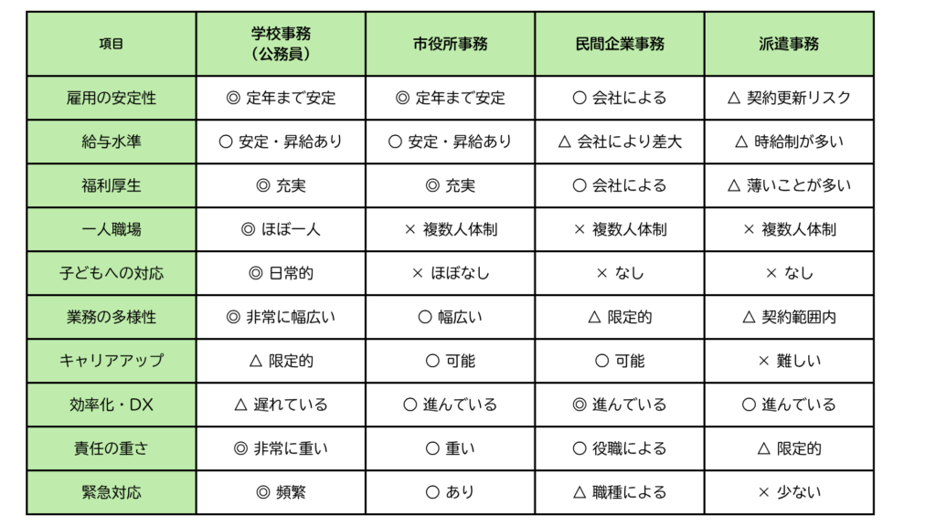 このように、学校事務は他の事務職と比べて特殊な環境であり、単純に「楽」「大変」と比較できるものではありません。