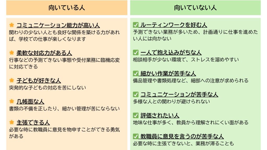 学校事務は安定していて、教員と比べると楽そうに見えますが、忙しく多岐にわたる業務をこなしています。自身の適性をしっかり見極め、選ぶ必要がありますね。