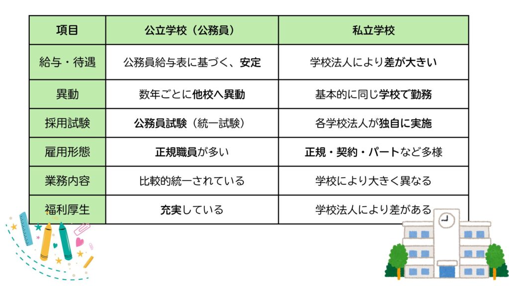 - 採用後:基本的に同じ学校で勤務、異動なし