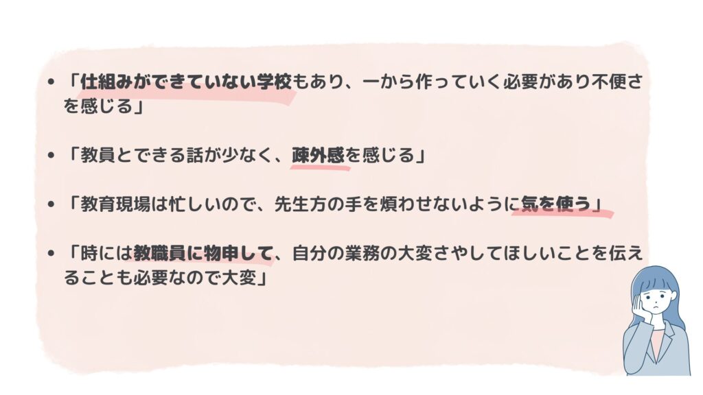 ✓ 教員との協働の難しさ 周りは教員ばかり。事務処理が苦手な教員のフォローに追われる