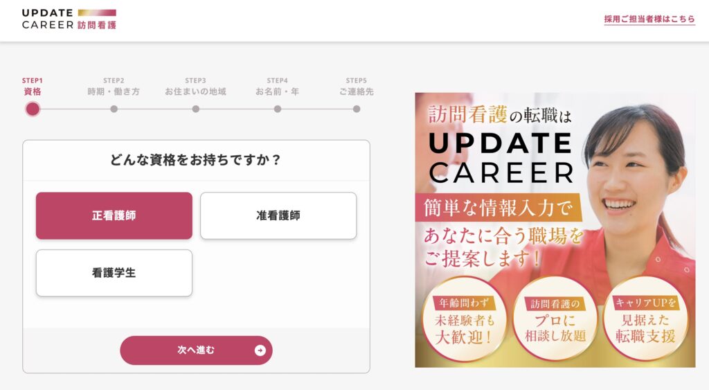 「UPDATE CAREER 訪問看護」は訪問看護業界特化の転職エージェントです。訪問看護の実務経験のあるアドバイザーがキャリア相談から求人紹介・面接に向けた準備・入社後フォローまで一貫してサポートします。