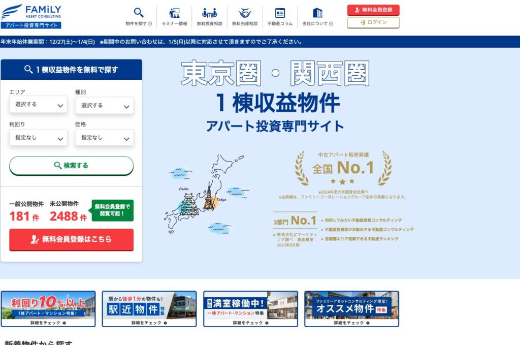 FAMiLY ASSET CONSULTINGは、一棟収益物件に特化した情報提供とサポートを行うサイトです。東京・関西を中心とした物件情報のほか、融資や税務に関するアドバイスも提供し、投資家が安心して資産運用できる環境を整えています。初心者から経験者まで幅広く活用できるサイトです。