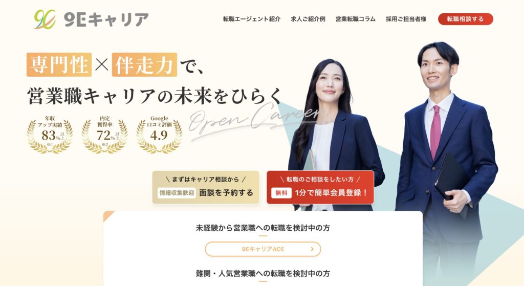 9Eキャリアは、「求職者のことを1番に考える伴走型転職エージェント」をコンセプトとした、営業職特化の転職エージェントです。営業職の中でも将来性の高い職種に特化し、業界初となるカスタマーサクセス職への転職支援に特化した「9Eキャリアカスタマーサービス」、インサイドセールス職への転職支援に特化した「9Eキャリアインサイドセールス」、IT/SaaS業界営業職への転職支援に特化した「9EキャリアIT・SaaSセールス」、キャリアアドバイザー職への転職支援に特化した「キャリアアドバイザーAgent求人ナビ」を運営。特化型だからこそ出会える厳選求人・企業の裏側まで熟知した一気通関型の支援、書類も面接も通過率が上がる伴走型支援を強みとしています。