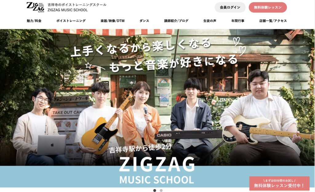 ZIGZAG MUSIC SCHOOLは、吉祥寺駅徒歩2分のボイトレスクール。SONY・エイベックス・劇団四季出身の講師陣が担当制でマンツーマン指導。ボーカル、ミュージカル、K-POP、声優、楽器、DTM、ダンスなど多彩なコースがあります。